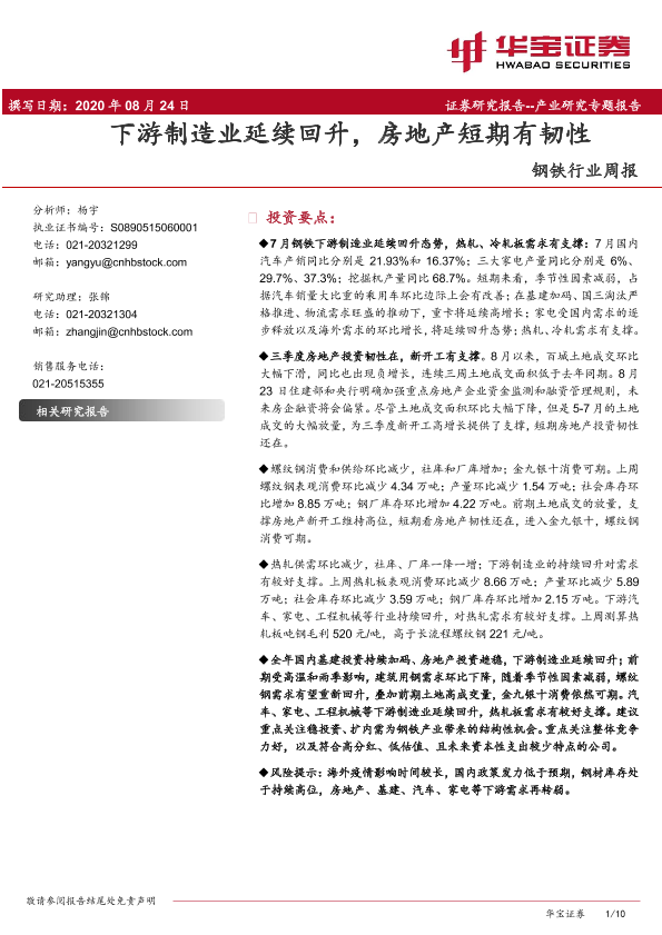 【华宝证券】【20200824】20200824-华宝证券-钢铁行业周报:下游制造业延续回升,房地产短期有韧性-10页