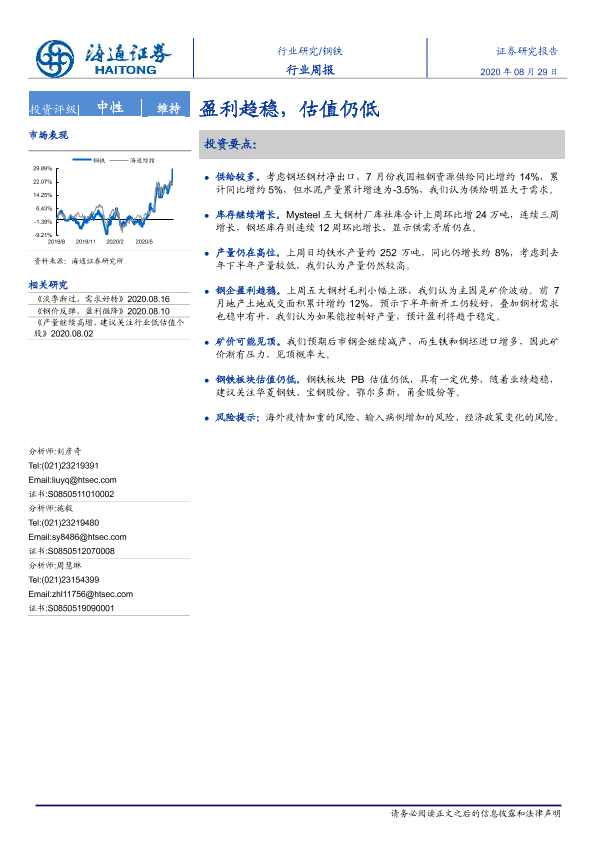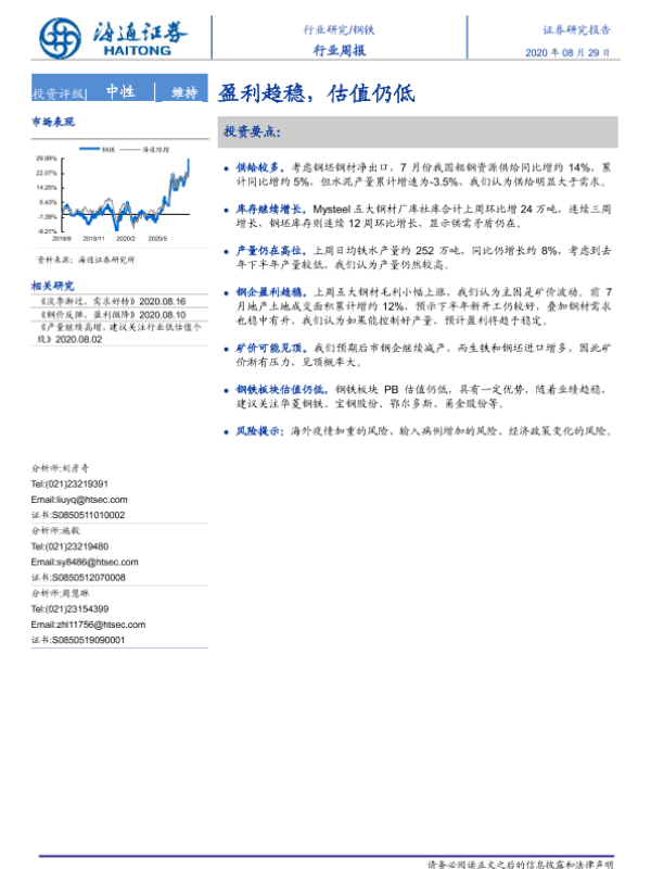 【海通证券】【20200829】20200829-海通证券-钢铁行业周报:盈利趋稳,估值仍低-13页