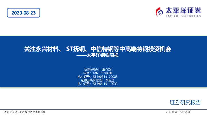 【太平洋证券】【20200823】20200823-太平洋-钢铁周报:关注永兴材料、ST抚钢、中信特钢等中高端特钢投资机会-52页
