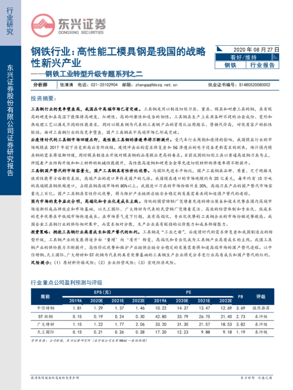 【东兴证券】【20200827】钢铁工业转型升级专题系列之二:钢铁行业:高性能工模具钢是我国的战略性新兴产业-29页