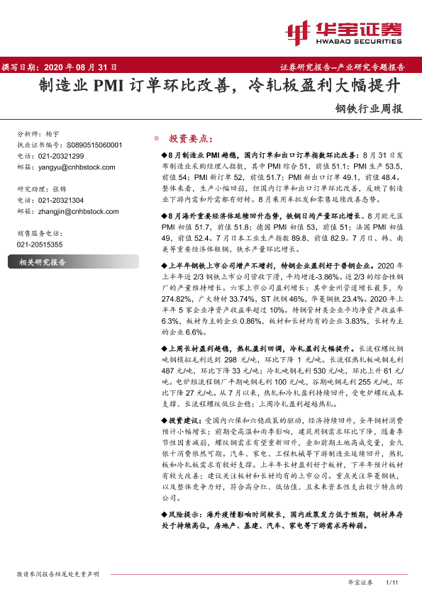 【华宝证券】【20200831】20200831-华宝证券-钢铁行业周报:制造业PMI订单环比改善,冷轧板盈利大幅提升-11页