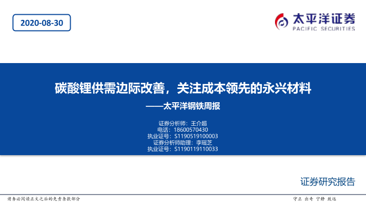 【太平洋证券】【20200830】20200830-太平洋-太平洋钢铁周报:碳酸锂供需边际改善,关注成本领先的永兴材料-52页