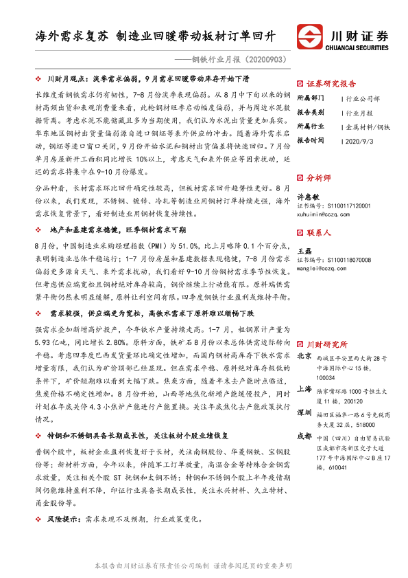 【川财证券】【20200903】20200903-川财证券-钢铁行业月报:海外需求复苏 制造业回暖带动板材订单回升-21页