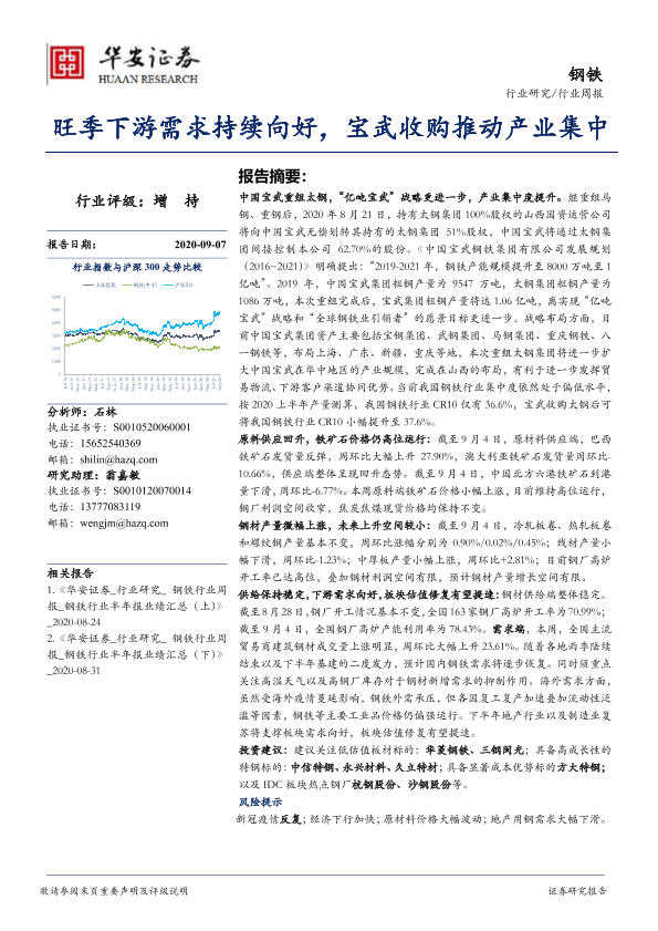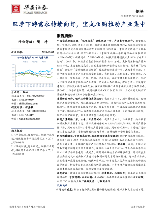 【华安证券】【20200907】20200907-华安证券-钢铁行业周报:旺季下游需求持续向好,宝武收购推动产业集中-25页