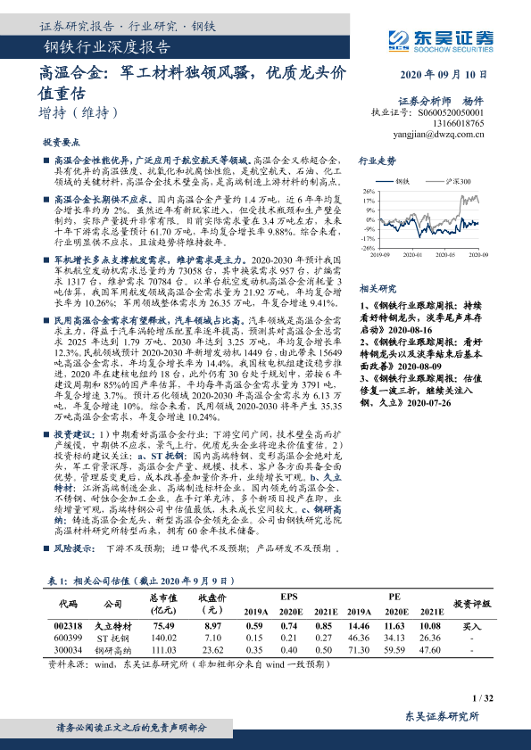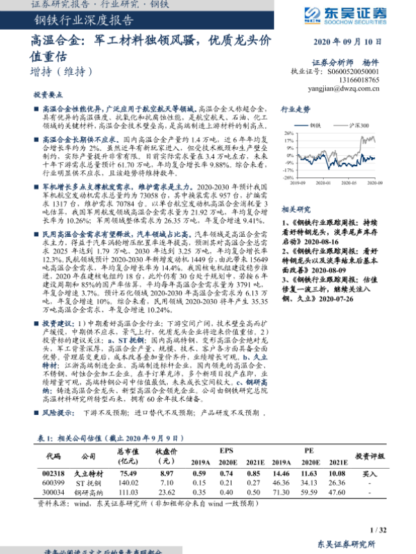 【东吴证券】【20200910】20200910-东吴证券-钢铁行业深度报告:高温合金:军工材料独领风骚,优质龙头价值重估-32页