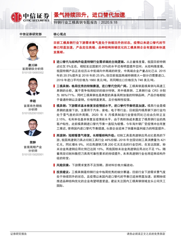 【中信证券】【20200918】20200918-中信证券-特钢行业工模具钢专题报告:景气持续回升,进口替代加速-20页