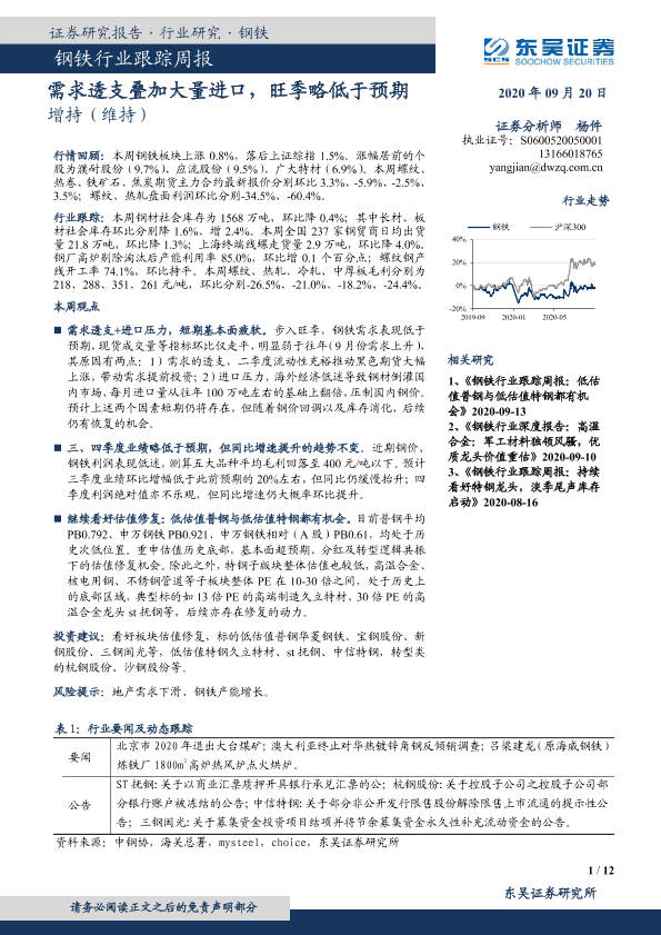 【东吴证券】【20200920】20200920-东吴证券-钢铁行业跟踪周报:需求透支叠加大量进口,旺季略低于预期-12页