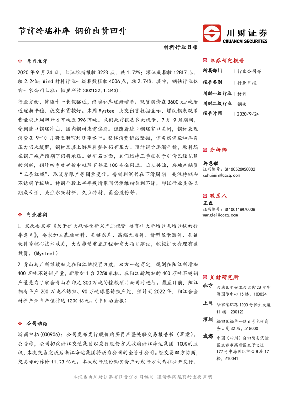 【川财证券】【20200924】材料行业日报:节前终端补库 钢价出货回升-3页