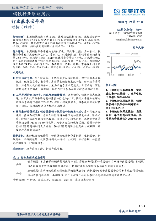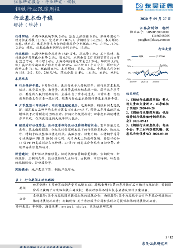【东吴证券】【20200927】20200927-东吴证券-钢铁行业跟踪周报:行业基本面平稳-12页