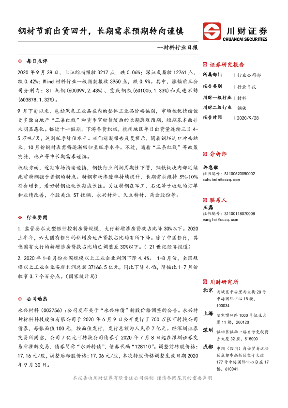 【川财证券】【20200928】材料行业日报:钢材节前出货回升,长期需求预期转向谨慎-3页