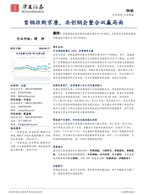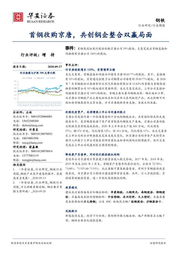 【华安证券】【20200927】20200927-华安证券-钢铁行业周报:首钢收购京唐,共创钢企整合双赢局面-25页