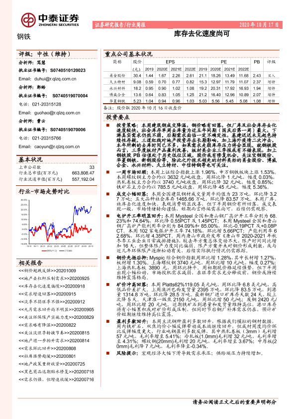 【中泰证券】【20201017】20201017-中泰证券-钢铁行业周报:库存去化速度尚可-13页