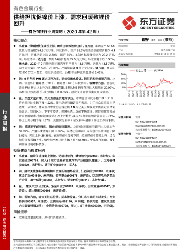 【东方证券】【20201018】有色钢铁行业周策略(2020年第42周):供给担忧促镍价上涨,需求回暖致锂价回升-25页