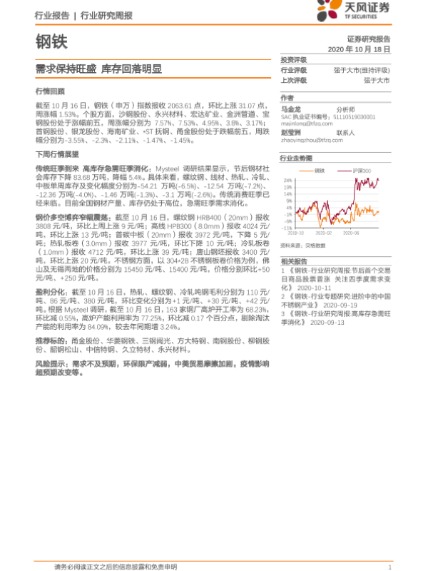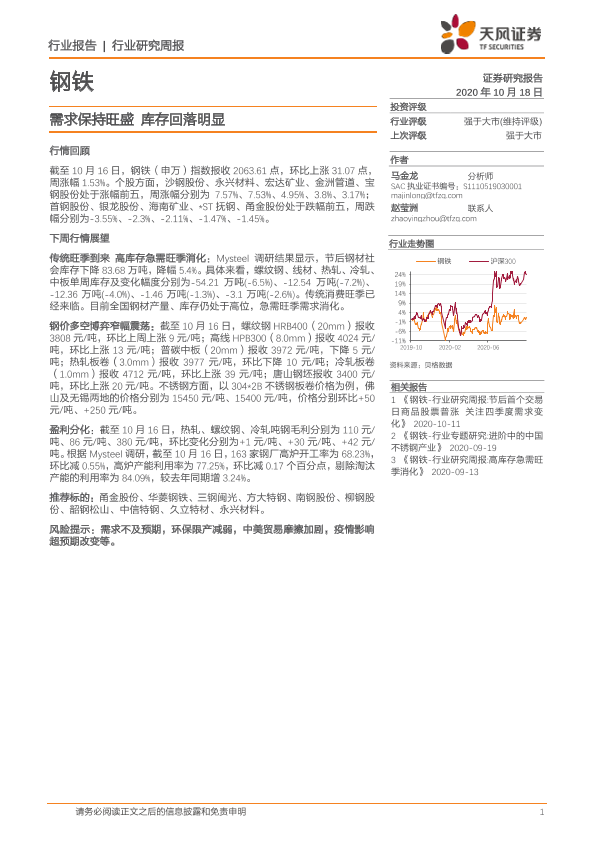 【天风证券】【20201018】20201018-天风证券-钢铁行业研究周报:需求保持旺盛 库存回落明显-13页