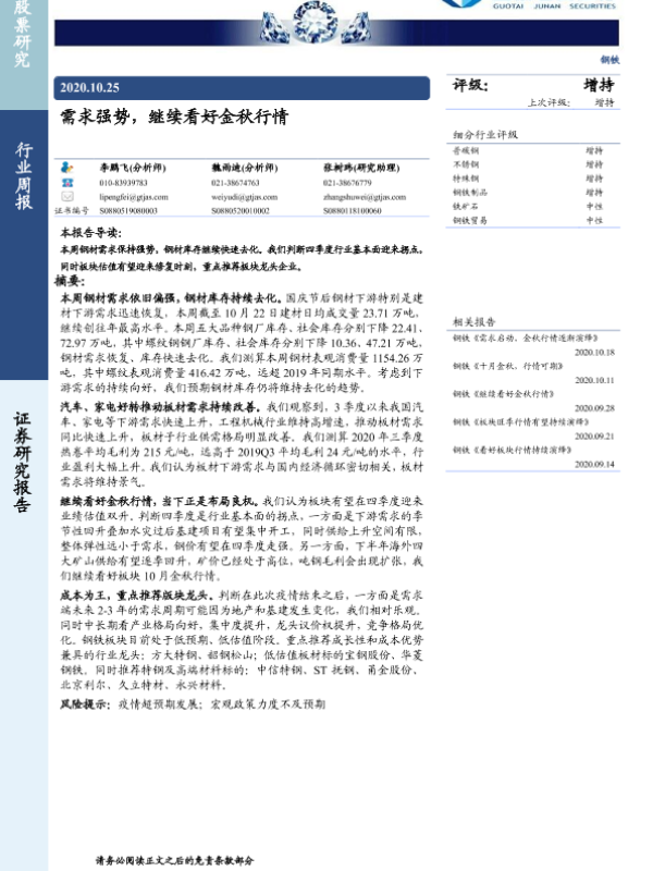 【国泰君安证券】【20201025】20201025-国泰君安-钢铁行业周报:需求强势,继续看好金秋行情-24页