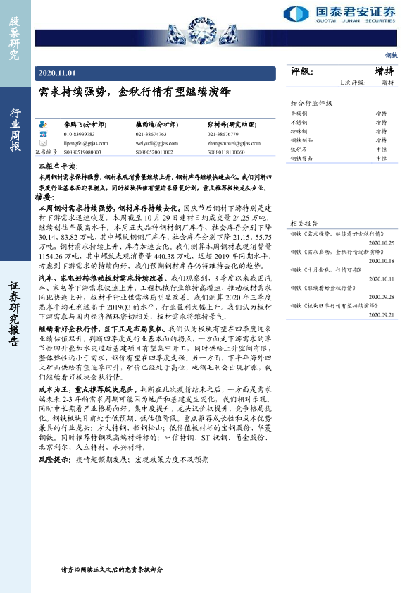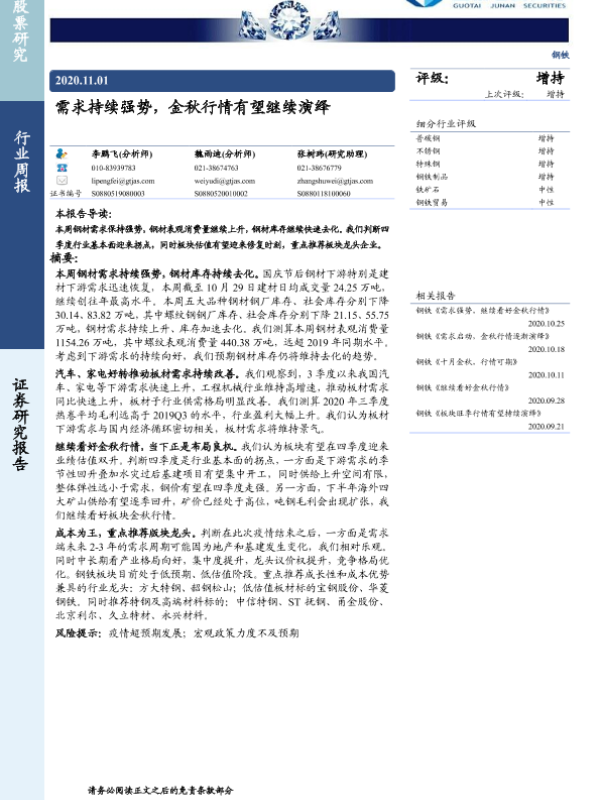 【国泰君安证券】【20201101】20201101-国泰君安-钢铁行业周报:需求持续强势,金秋行情有望继续演绎-24页