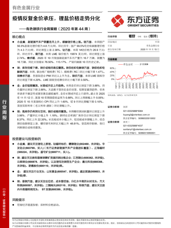【东方证券】【20201115】20201115-东方证券-有色钢铁行业周策略(2020年第44周):疫情反复金价承压,锂盐价格走势分化-28页