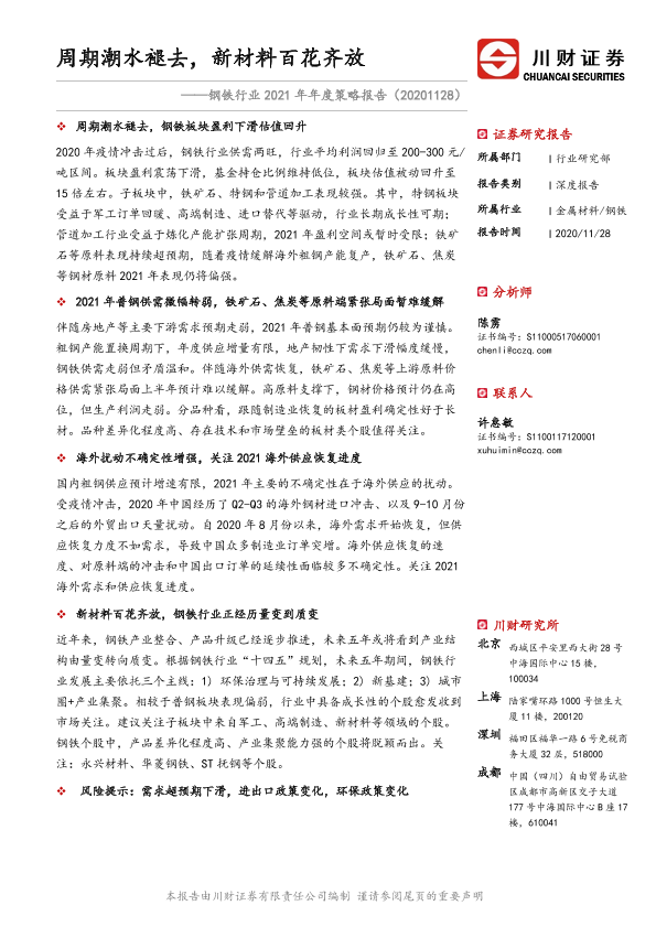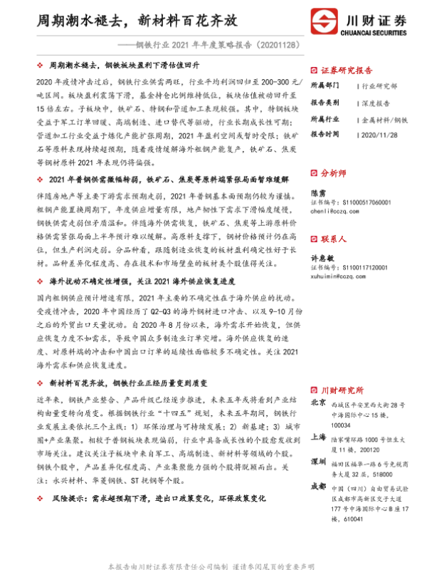 【川财证券】【20201128】钢铁行业2021年年度策略报告:周期潮水褪去,新材料百花齐放-23页
