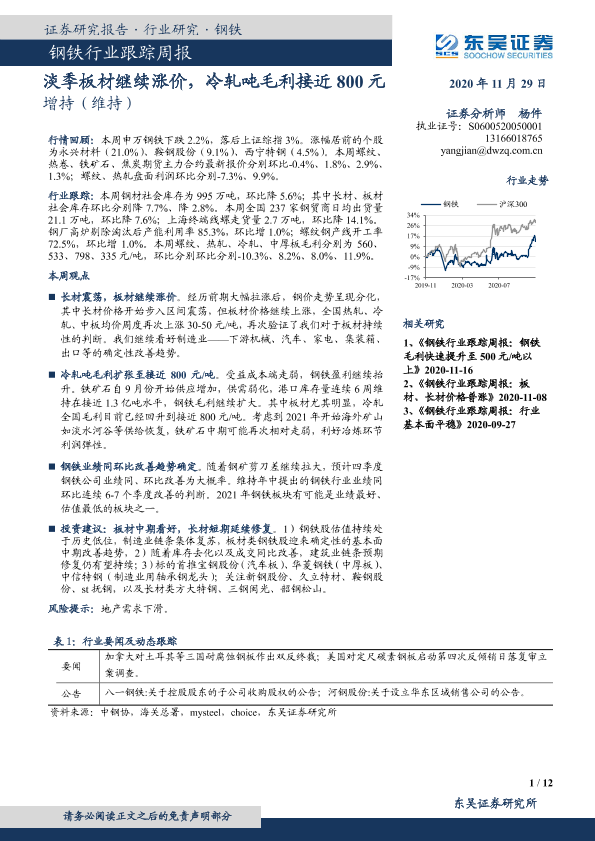 【东吴证券】【20201129】20201129-东吴证券-钢铁行业跟踪周报:钢耗淡季板材继续涨价,冷轧吨毛利接近800元-12页