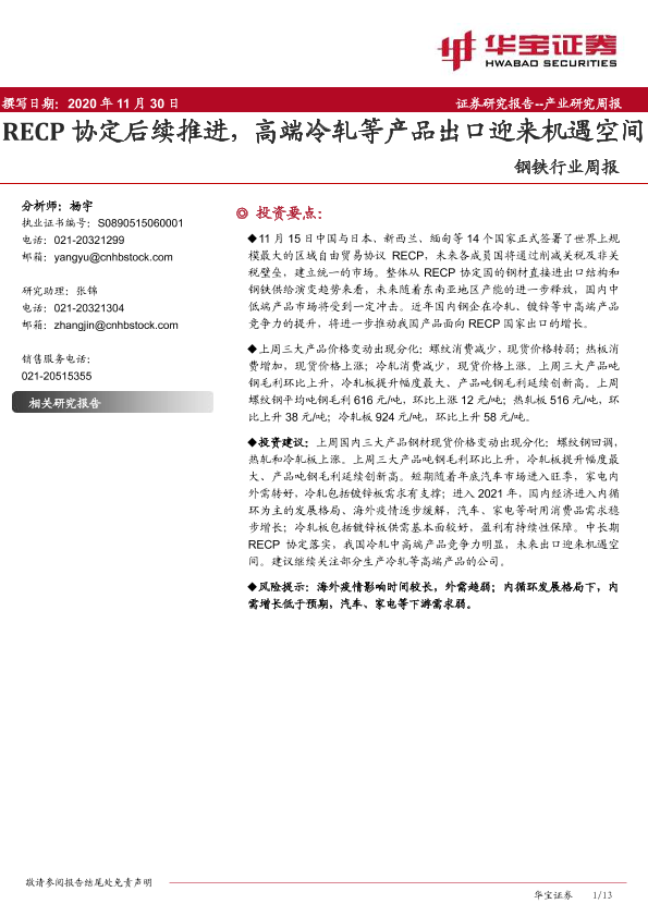 【华宝证券】【20201130】20201130-华宝证券-钢铁行业周报:RECP协定后续推进,高端冷轧等产品出口迎来机遇空间-13页