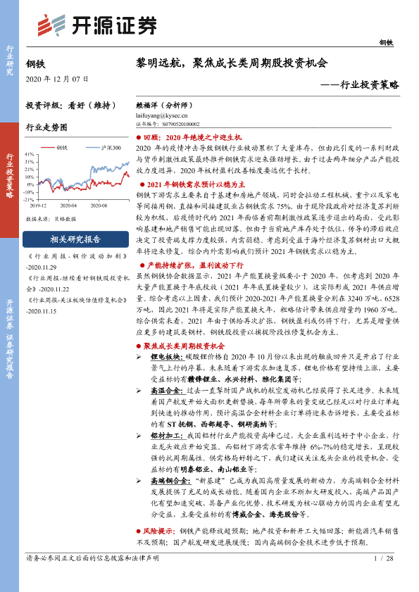 【开源证券】【20201207】20201207-开源证券-钢铁行业投资策略:黎明远航,聚焦成长类周期股投资机会-28页
