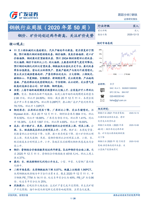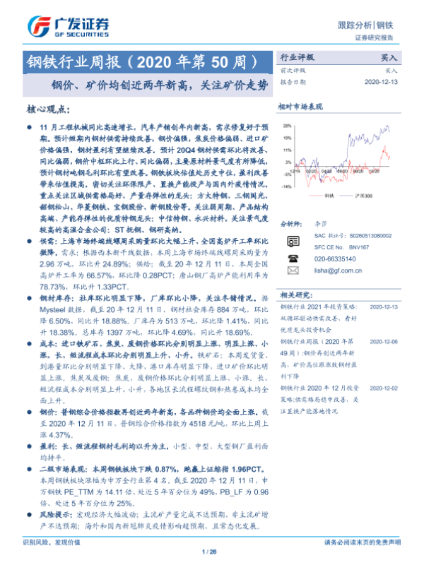 【广发证券】【20201213】钢铁行业周报(2020年第50周):钢价、矿价均创近两年新高,关注矿价走势-26页