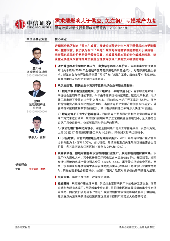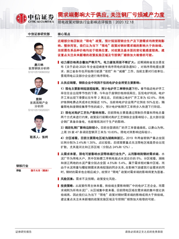 【中信证券】【20201218】限电政策对钢铁行业影响点评报告:需求端影响大于供应,关注钢厂亏损减产力度-2页