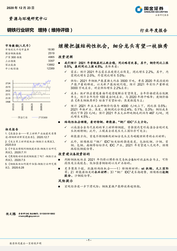 【国金证券】【20201223】20201223-国金证券-钢铁行业研究:继续把握结构性机会,细分龙头有望一枝独秀-18页