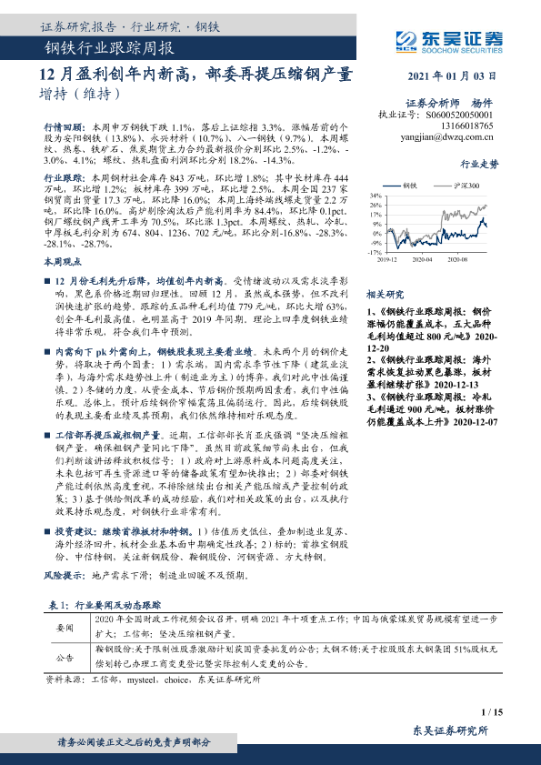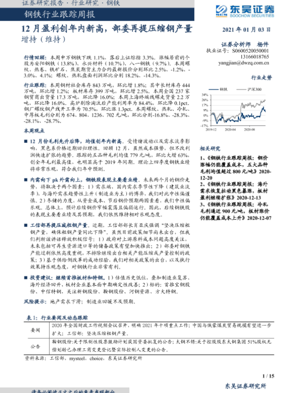 【东吴证券】【20210103】20210103-东吴证券-钢铁行业跟踪周报:12月盈利创年内新高,部委再提压缩钢产量-15页