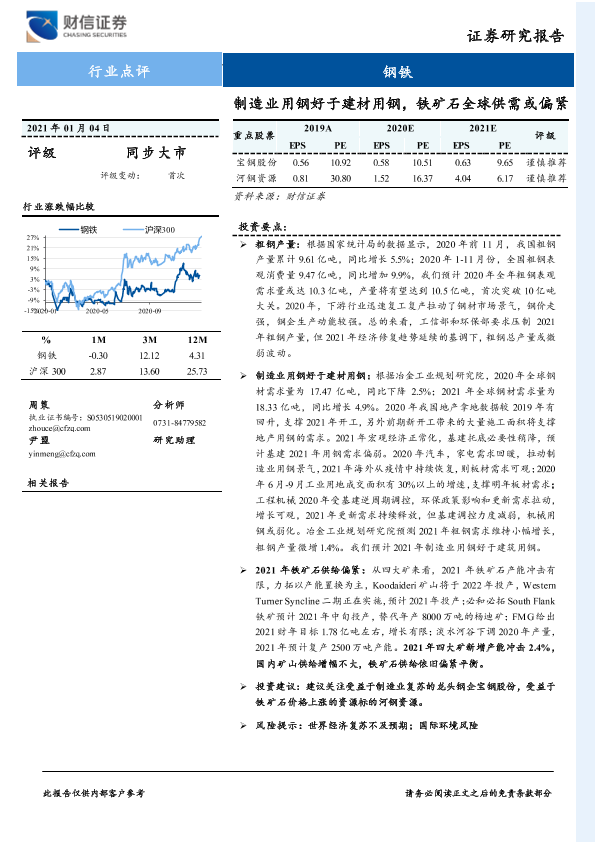 【财信证券】【20210104】钢铁行业点评:制造业用钢好于建材用钢,铁矿石全球供需或偏紧-4页