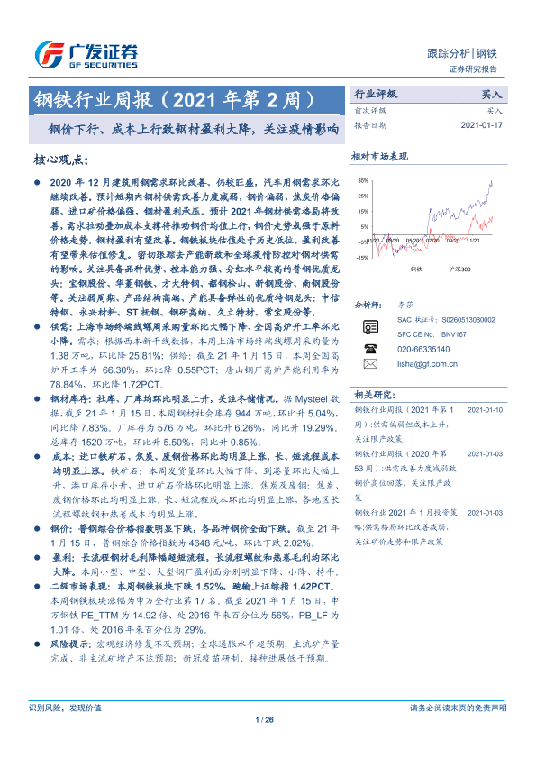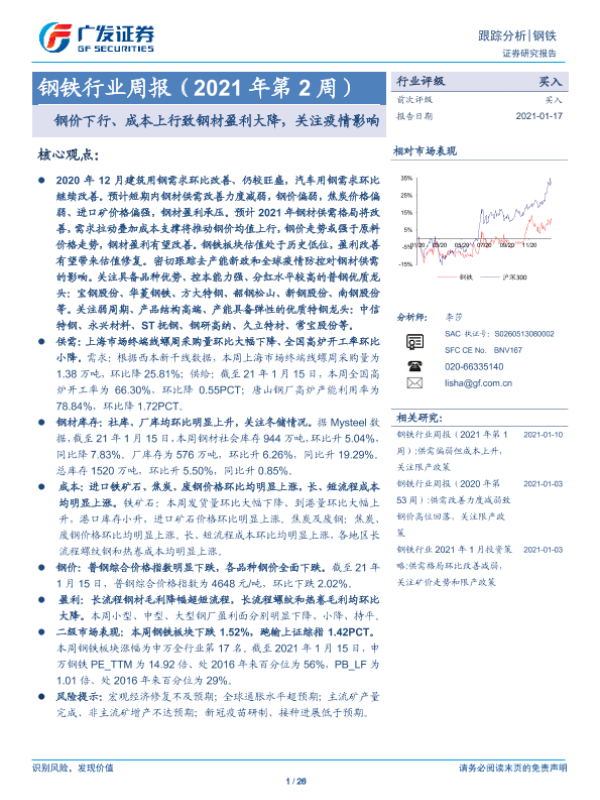 【广发证券】【20210117】钢铁行业周报(2021年第2周):钢价下行、成本上行致钢材盈利大降,关注疫情影响-26页