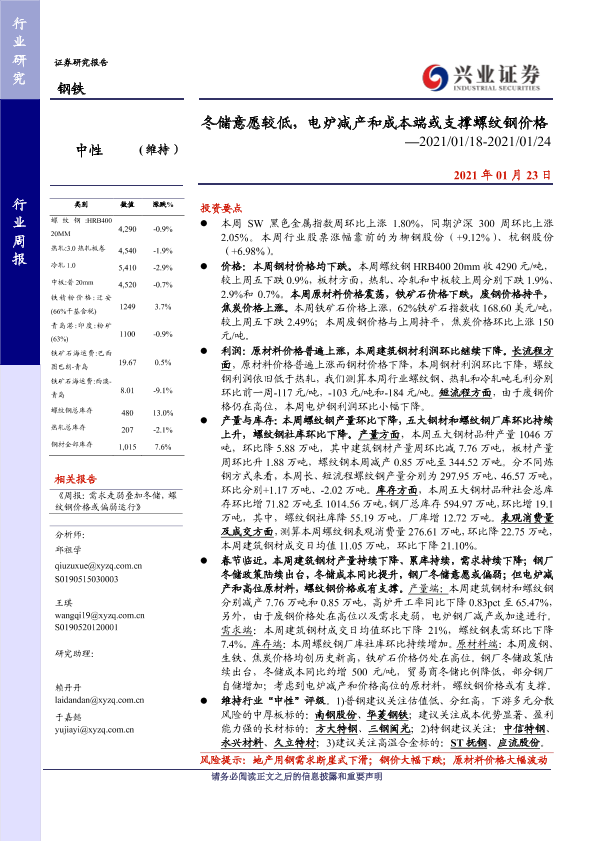 【兴业证券】【20210123】冬储意愿较低,电炉减产和成本端或支撑螺纹钢价格-17页
