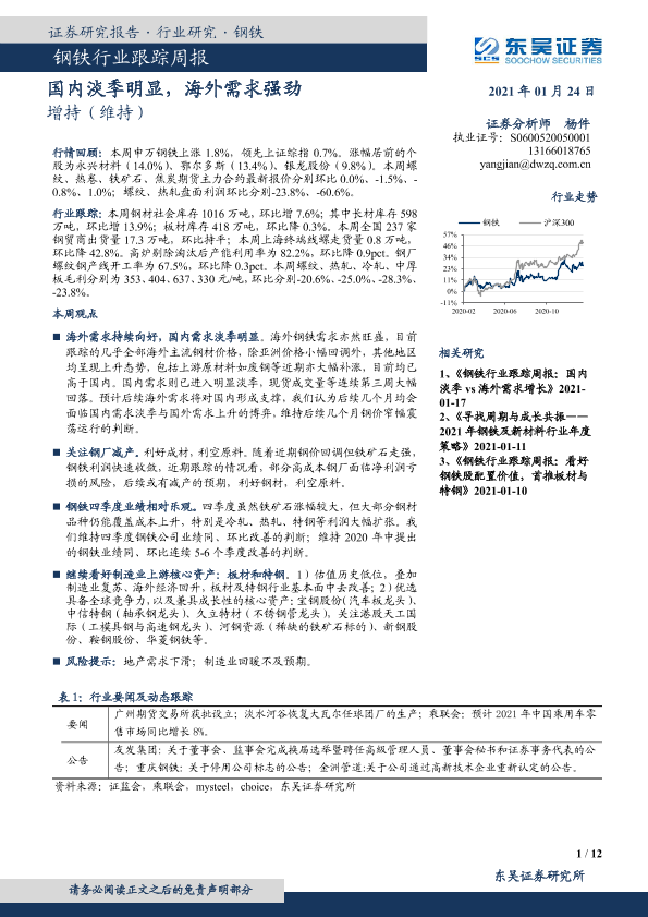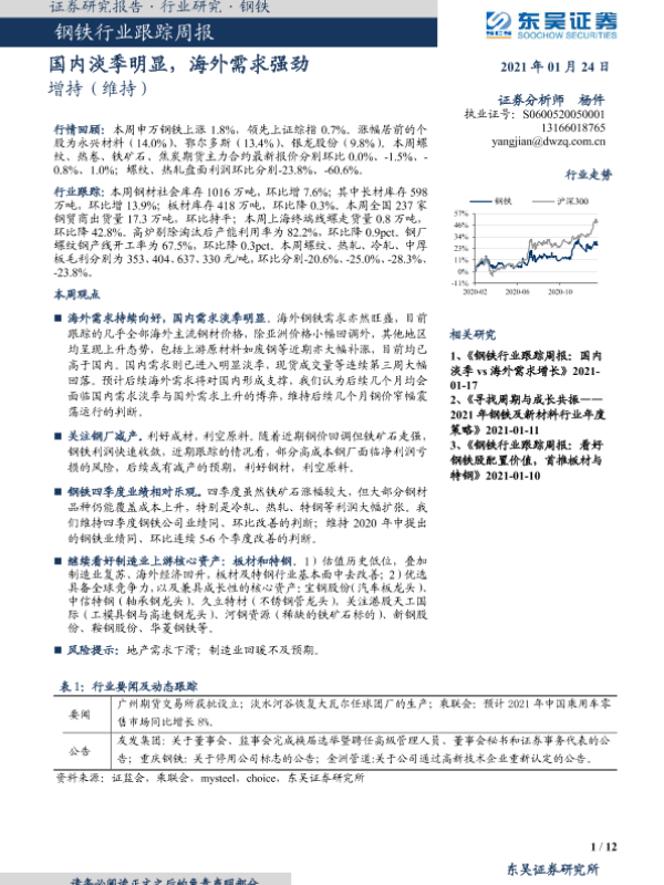 【东吴证券】【20210124】20210124-东吴证券-钢铁行业跟踪周报:国内淡季明显,海外需求强劲-12页