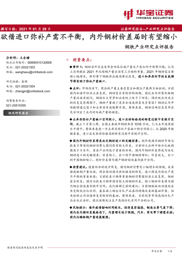 【华宝证券】【20210128】20210128-华宝证券-钢铁产业研究点评报告:欲借进口弥补产需不平衡,内外钢材价差届时有望缩小-6页