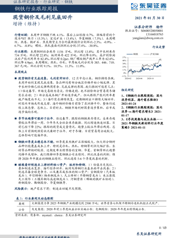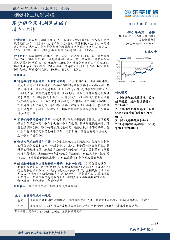 【东吴证券】【20210130】钢铁行业跟踪周报:现货钢价及毛利见底回升-13页