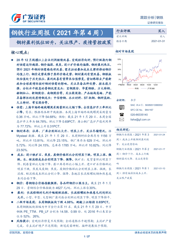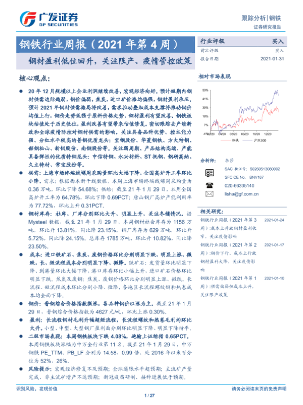 【广发证券】【20210131】20210131-广发证券-钢铁行业周报(2021年第4周):钢材盈利低位回升,关注限产、疫情管控政策-27页