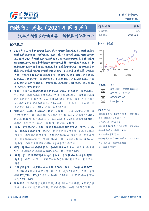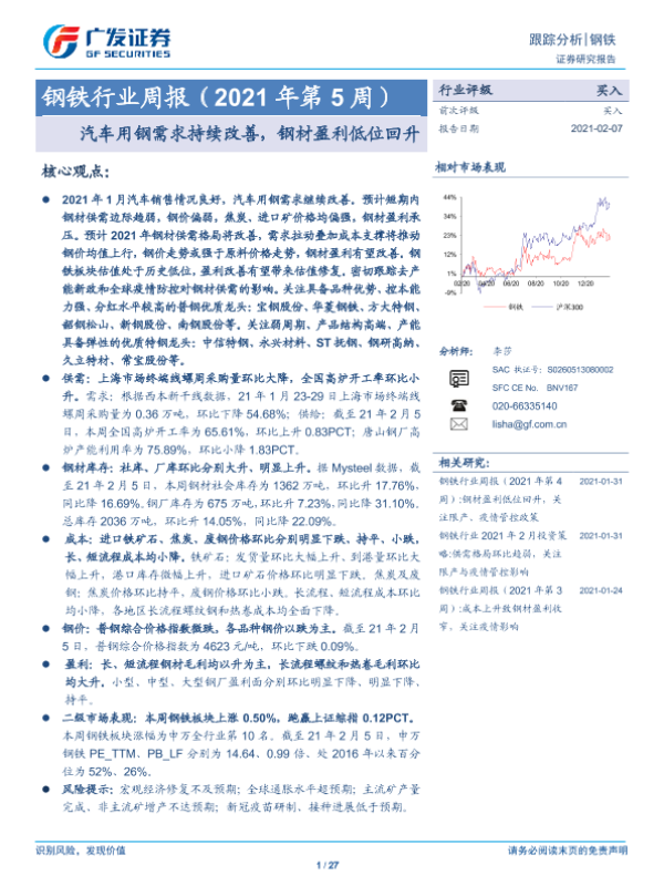 【广发证券】【20210207】钢铁行业周报(2021年第5周):汽车用钢需求持续改善,钢材盈利低位回升-27页