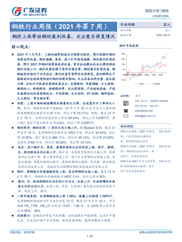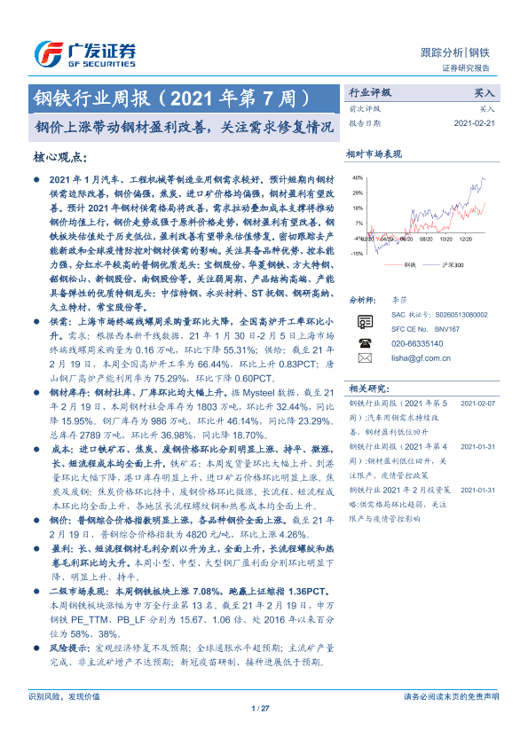 【广发证券】【20210221】20210221-广发证券-钢铁行业周报(2021年第7周):钢价上涨带动钢材盈利改善,关注需求修复情况-27页