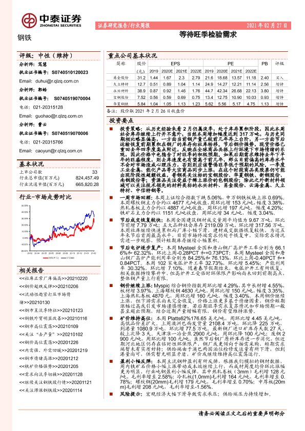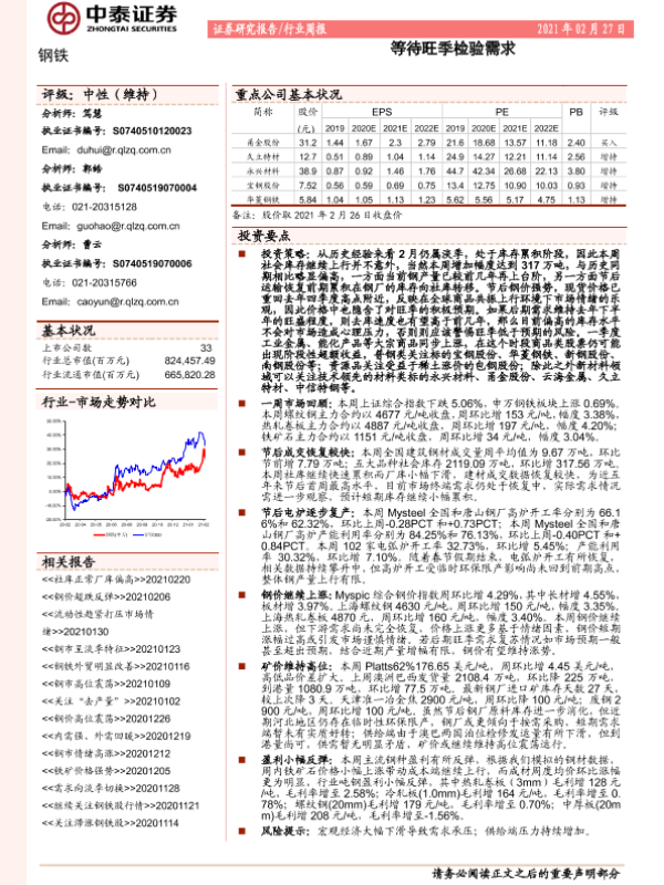 【中泰证券】【20210227】20210227-中泰证券-钢铁行业周报:等待旺季检验需求-12页