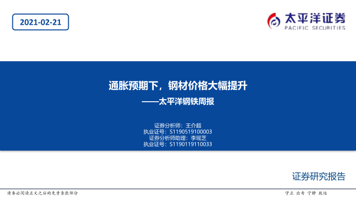【太平洋证券】【20210221】20210221-太平洋-钢铁周报:通胀预期下,钢材价格大幅提升-50页