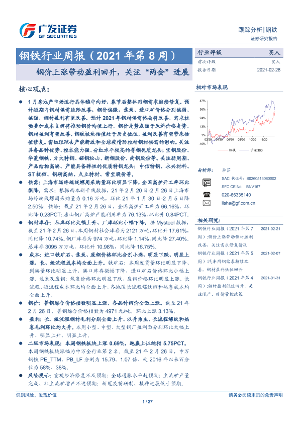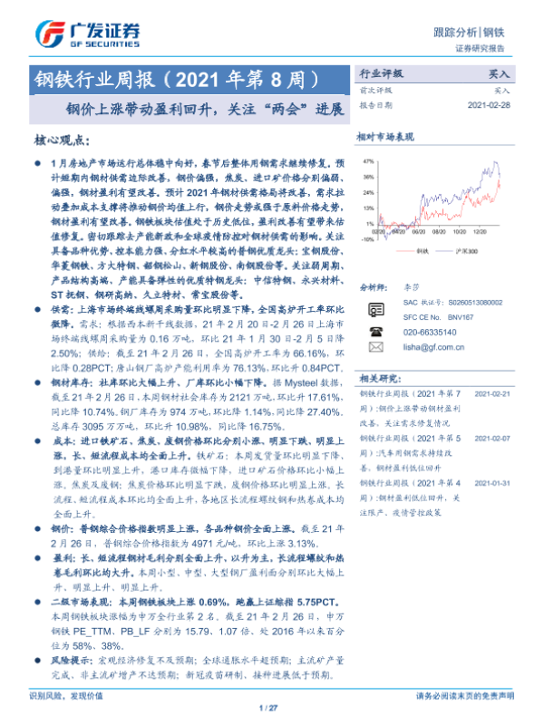 【广发证券】【20210228】钢铁行业周报(2021年第8周):钢价上涨带动盈利回升,关注“两会”进展-27页