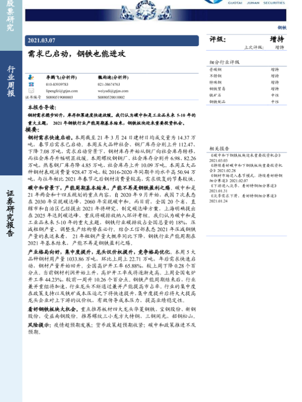 【国泰君安证券】【20210307】20210307-国泰君安-钢铁行业周报:需求已启动,钢铁也能进攻-22页