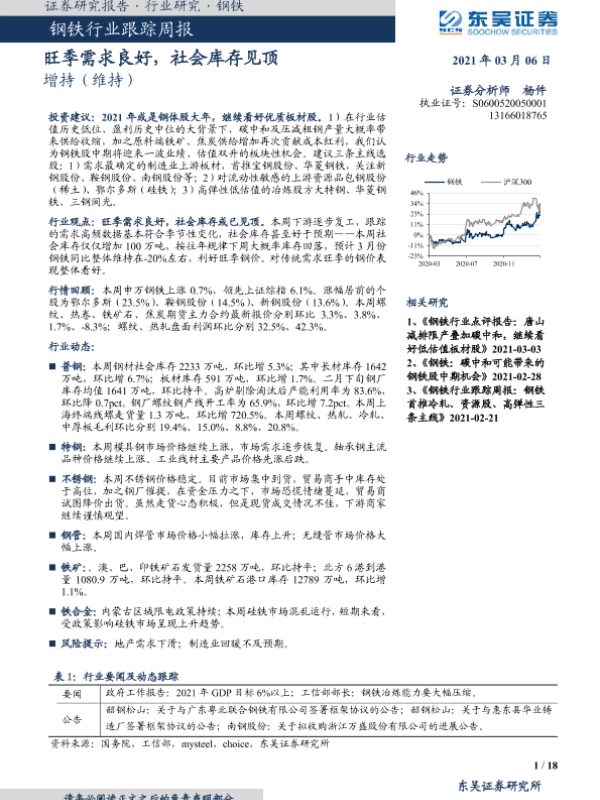 【东吴证券】【20210306】20210306-东吴证券-钢铁行业跟踪周报:旺季需求良好,社会库存见顶-18页