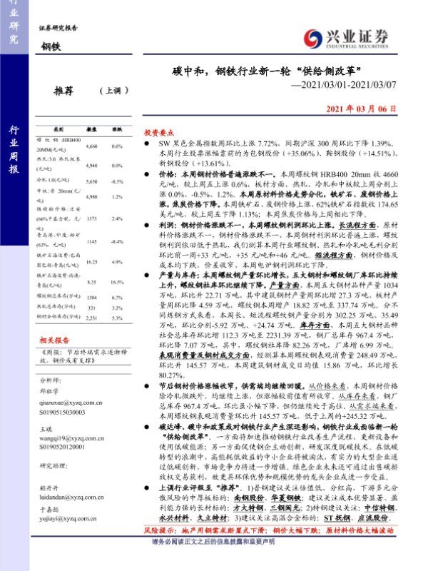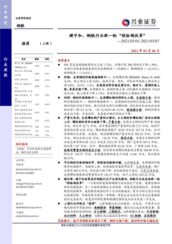 供给侧改革 库存 碳中和 钢材价格 钢铁行业
