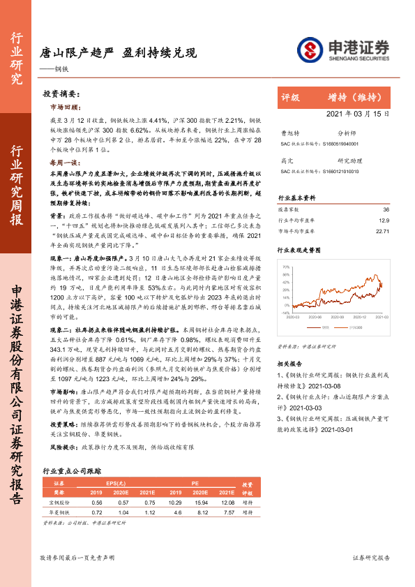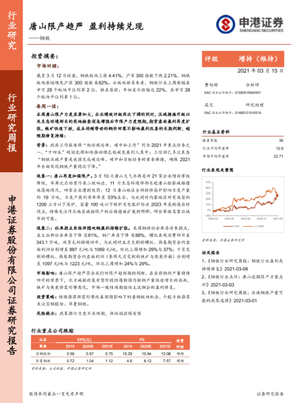 【申港证券】【20210315】20210315-申港证券-钢铁行业研究周报:唐山限产趋严,盈利持续兑现-6页
