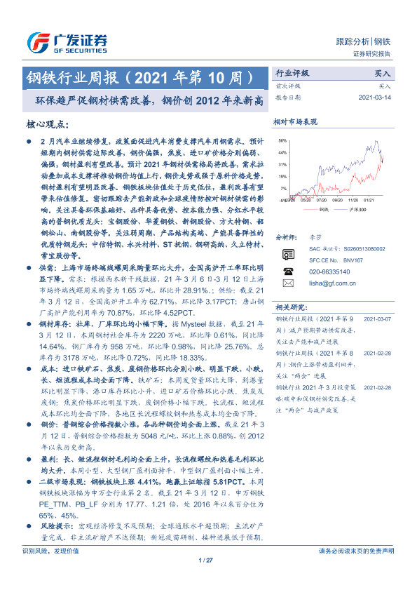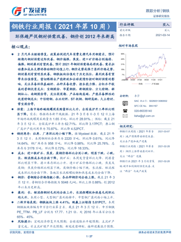 【广发证券】【20210314】钢铁行业周报(2021年第10周):环保趋严促钢材供需改善,钢价创2012年来新高-27页