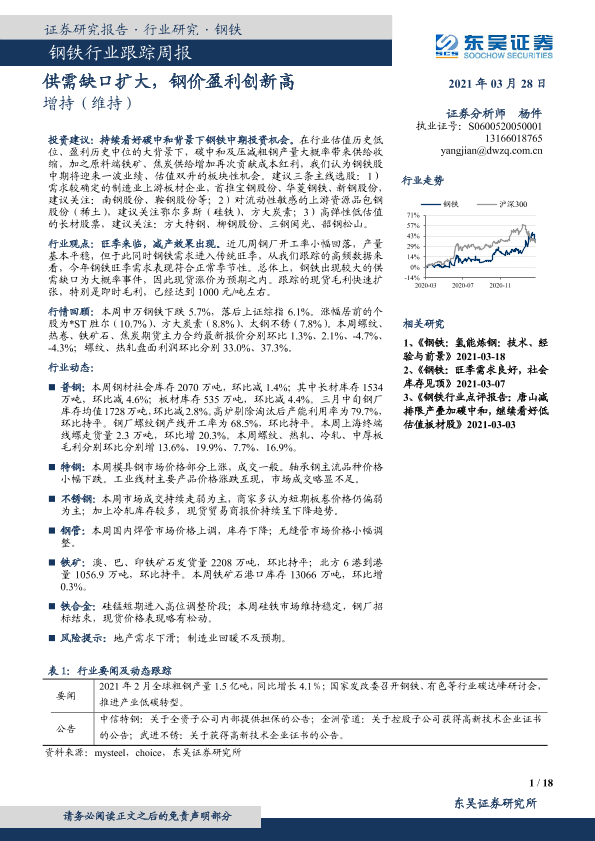 【东吴证券】【20210328】20210328-东吴证券-钢铁行业跟踪周报:供需缺口扩大,钢价盈利创新高-18页