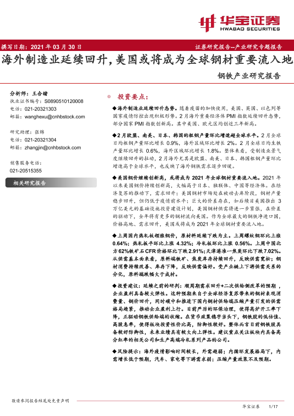 【华宝证券】【20210330】20210330-华宝证券-钢铁产业研究报告:海外制造业延续回升,美国或将成为全球钢材重要流入地-17页