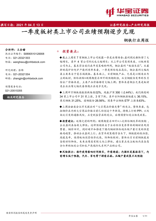 【华宝证券】【20210413】20210413-华宝证券-钢铁行业周报:一季度板材类上市公司业绩预期逐步兑现-11页