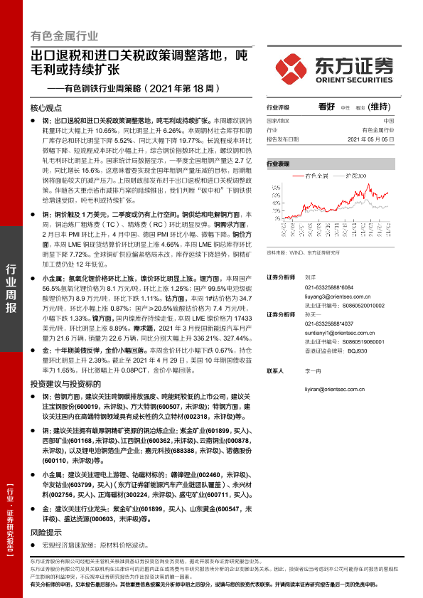 【东方证券】【20210505】20210505-东方证券-有色钢铁行业周策略(2021年第18周):出口退税和进口关税政策调整落地,吨毛利或持续扩张-27页